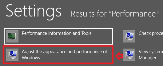 Trên Windows 8 trở đi, Bạn di chuột sang góc bên phải của màn hình. Chọn Search và tìm “Performance“. Trong phần Setting bạn sẽ thấy