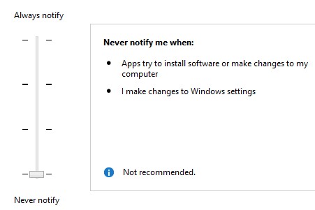 Máy tính sẽ kiểm tra và hiện hộp thoại yêu cầu bạn xác nhận khi cài phần mềm, cài đặt các thiết lập. Điều này đảm bảo mục đích an ninh, tuy nhiên các hộp thoại thông báo này làm Delay, tăng thời gian thao tác cũng như làm chậm máy. Lời khuyên của mình là bạn nên thiết lập lại User Account Control về mức thấp nhất, không hiện thông báo nữa.