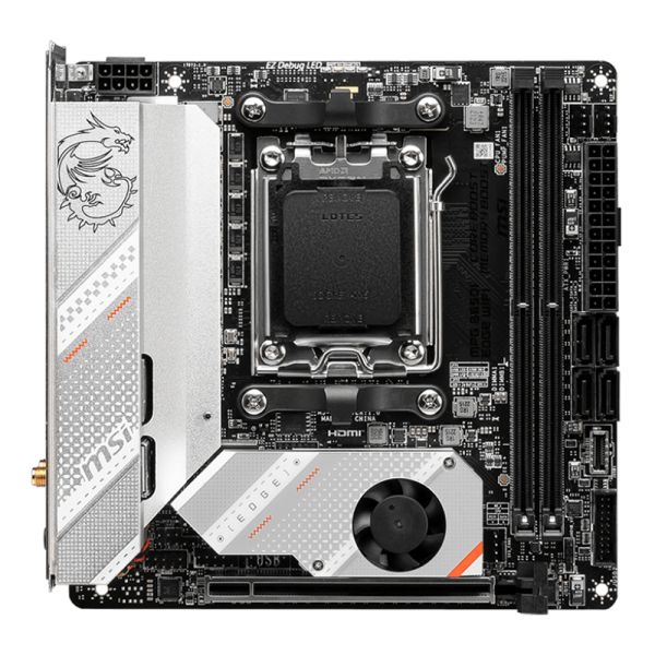 Thiết kế tông màu trắng – bạc sang trọng, kết hợp heatsink VRM lớn và hệ thống tản nhiệt M.2 Shield Frozr giúp tối ưu khả năng làm mát. Đây là lựa chọn lý tưởng cho những bộ PC Mini-ITX hiện đại, vừa nhỏ gọn vừa bền bỉ.