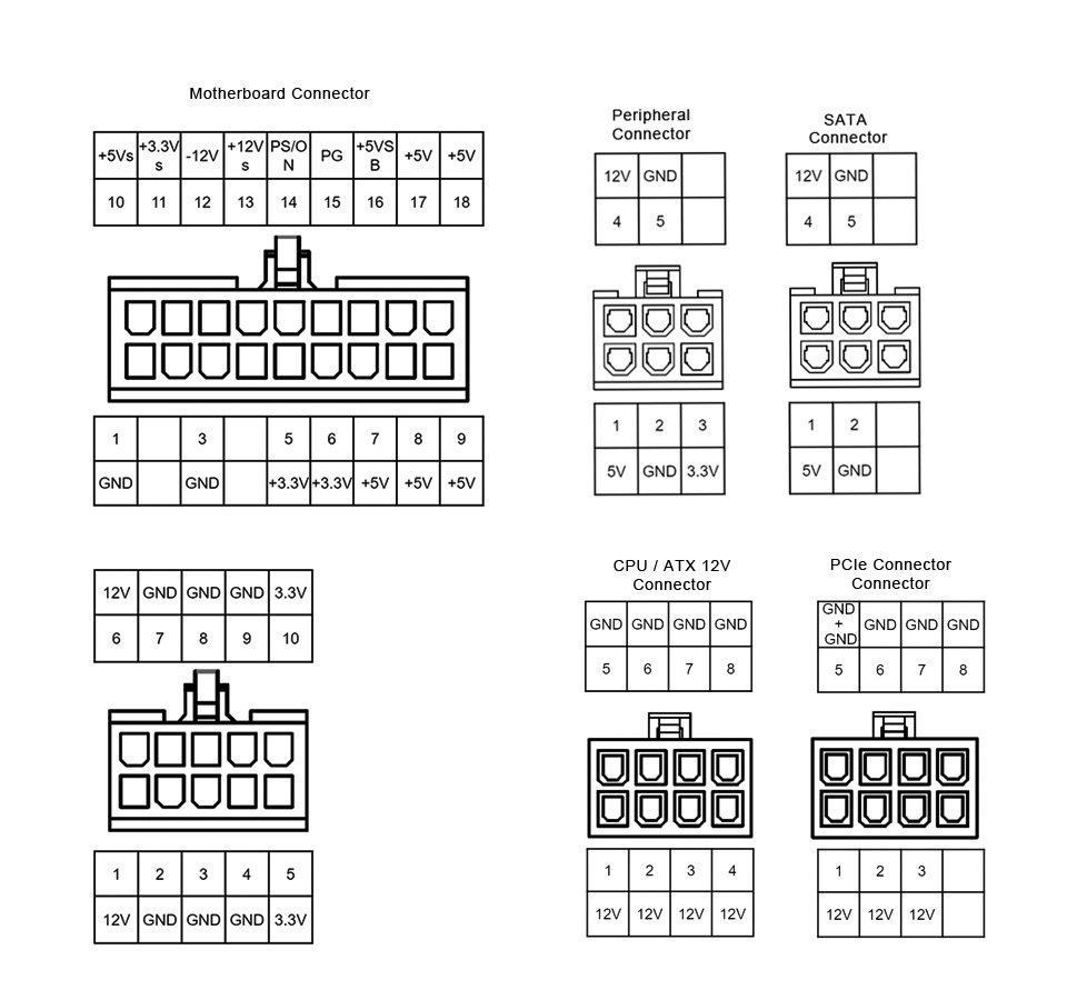 | CONNECTORS | 1 x 24 / 20-Pin motherboard connector (300mm) x 1pcs 2 x 8 / 4-Pin CPU / ATX 12V connector (450mm-70mm) x 1 pcs 1 x 8 / 6+2 Pin PCIe connector (400mm) x 1pcs 2 x 8 / 6+2 Pin PCIe connector (400mm-120mm) x 1pcs 4 x SATA connector (120mm-120mm-120mm-120mm) x 2pcs 4 x 4-Pin Peripheral connector (120mm-120mm-120mm-120mm) x 1pcs  |